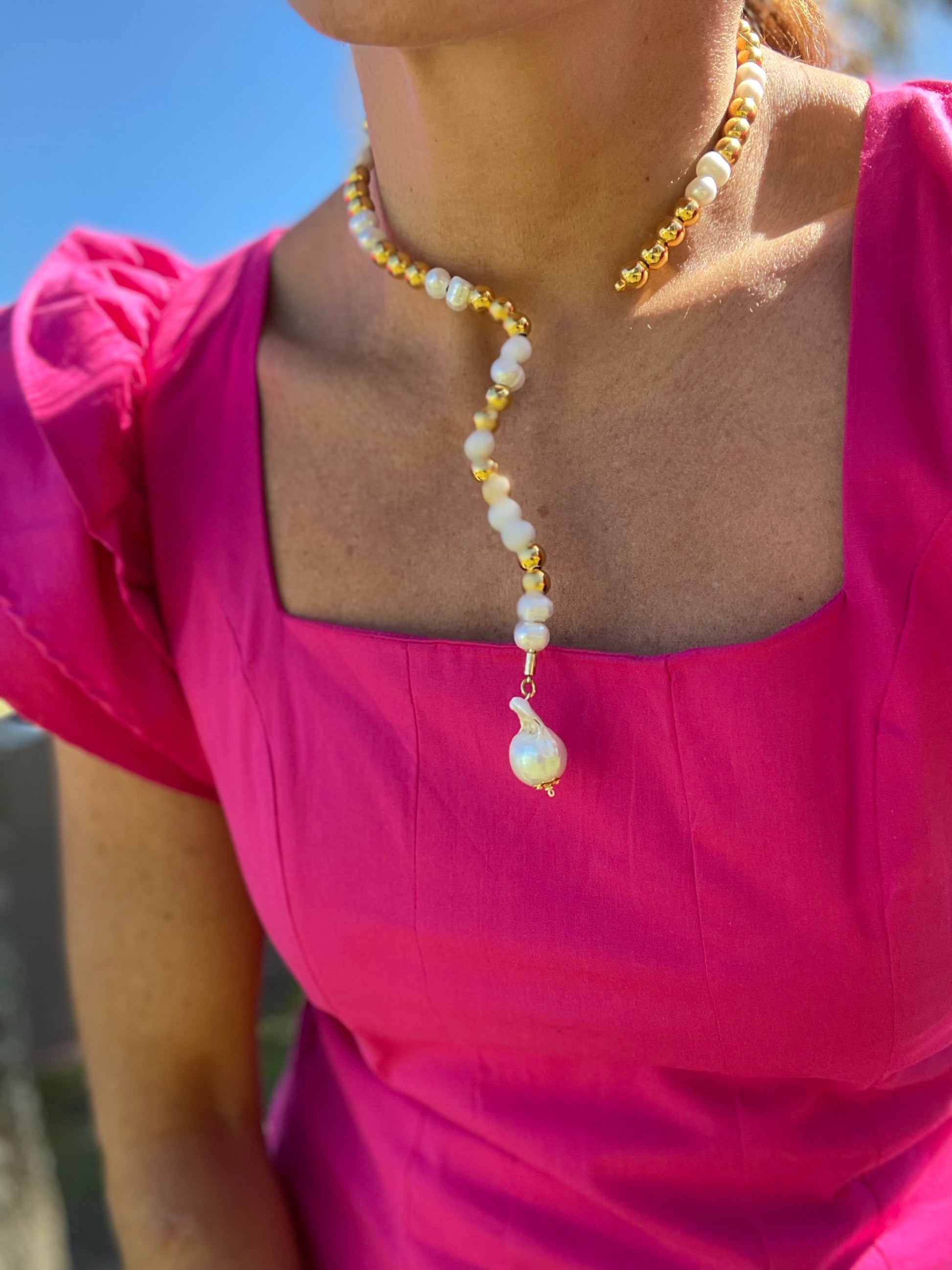 *Bold wrap necklace made with 18 kts brass gold plated and potato pearls .