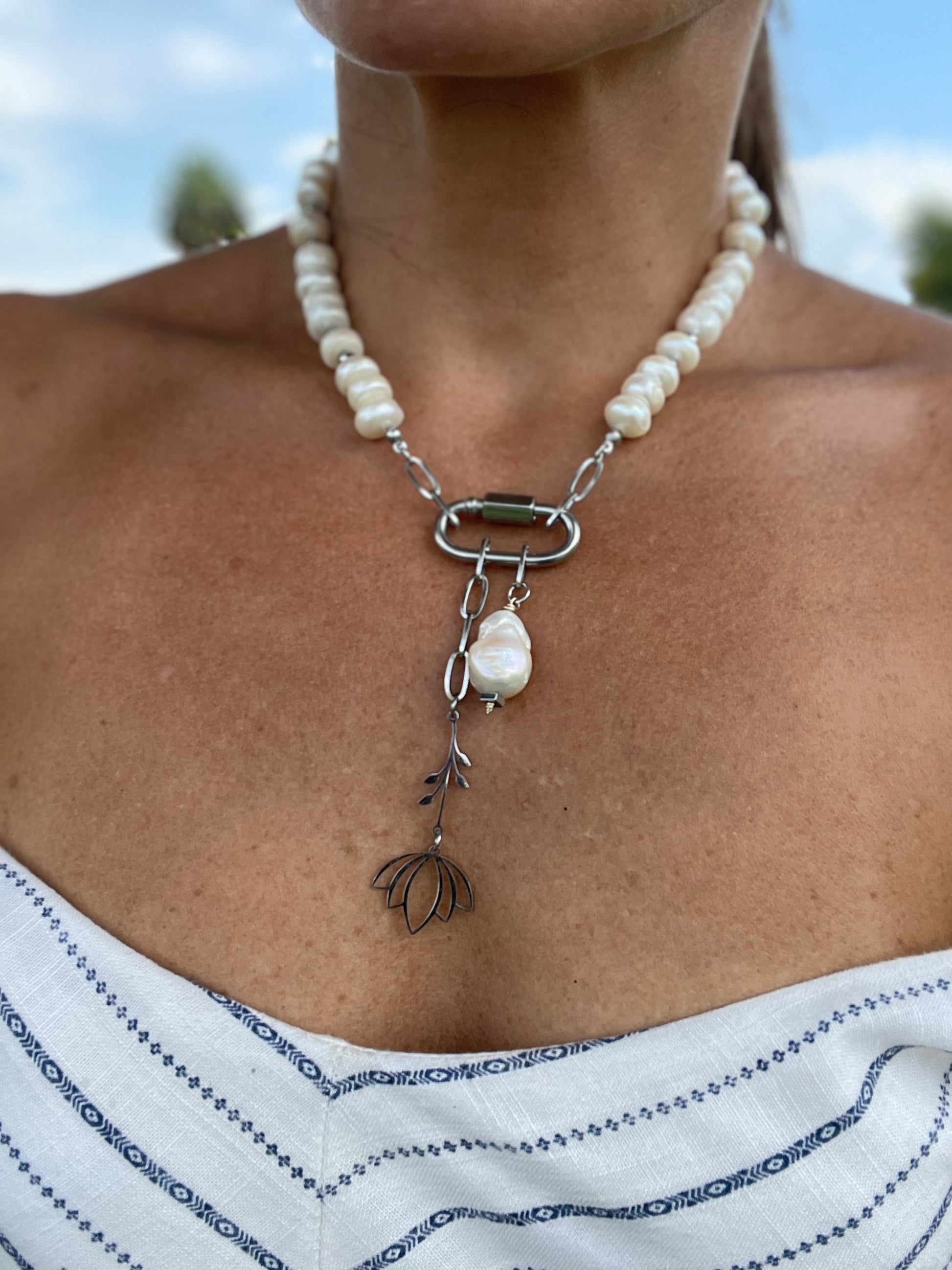 This beautiful potato pearls and lock necklace is always a bright idea for your outfits.